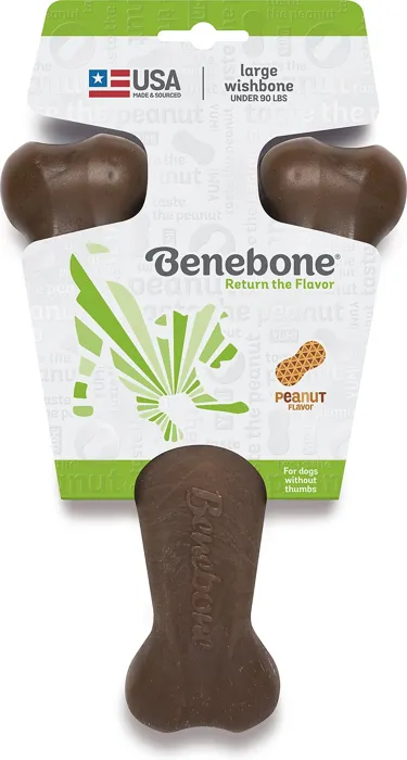 h3. Flavored Wishbone Dog Chew Toy, Made in USAAt Benebone, we started with the premise that dogs experience scent and flavor in a way we can’t even grasp. So, we ditched the neon colors and loud squeaks. Inspired by the dog’s powerful sense of smell, we developed a long-lasting durable chew that’s jam-packed with real flavor. Once your dog takes a bite of our USA-made chews, he’ll be hooked.* **Dog-Friendly Design** – Last time we checked, dogs don’t have thumbs. Our wishbone chew is cleverly designed so your pup can get a good chew going.* **Real Flavor** – We use only 100% real food ingredients for irresistible flavor and scent. We fuse 100% USA-sourced REAL BACON, REAL PEANUTS, or REAL CHICKEN all the way through the chew. Dogs can tell the difference.* **Made in the USA** – We are fully committed to Made in USA, including packaging, tooling, and all material and ingredient sourcing. We proudly manufacture our products in New York.* **Dog Welfare** – We are fully committed to the welfare of dogs through product donations and community involvement.* **Safety First** – Benebones are not edible. Supervise closely and discard/replace when appropriate.**Instructions for Use and Safety Information:*** We use real flavors, including peanuts. Ensure nobody in the household is allergic to any of our tantalizing ingredients.* While recognizing that weight limit is a rough guide, our small products are for dogs under 30 lbs, our medium products are for dogs under 60 lbs, and our large products are for dogs under 90 lbs. Always choose the largest size your dog can handle.