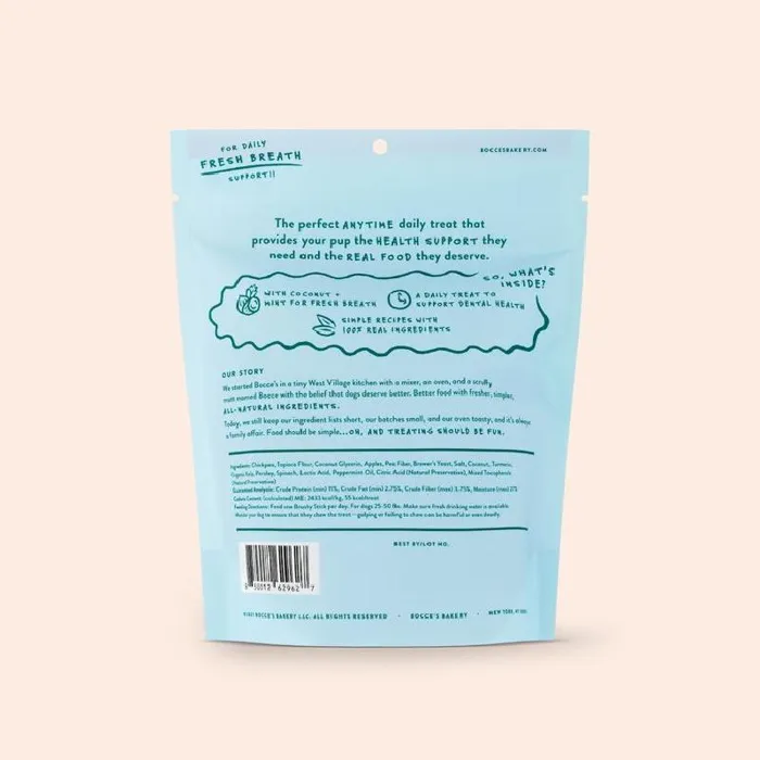Every Bocce's Brushy Stick dental bar is made with limited and simple ingredients like nutty coconut and crisp mint to support your doggy’s overall dental health and extra fresh breath. (Don’t worry - no artificial ‘flavorings’ or fillers here.) Oh, and bristle-shaped for extra cleaning, too! Brushy Sticks dental bars are available in 3 sizes - for the safest treat time, it's important to choose the right size dental bar based on your pup’s weight. Small: 5-25 lbs | Medium: 25-50 lbs | Large: 50+ lbs