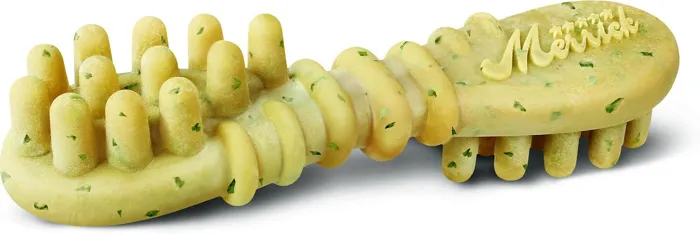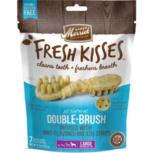 Share even closer cuddles with your furry one with the Merrick Fresh Kisses Double-Brush Mint Breath Strips Small Grain-Free Dental Dog Treats. This uniquely designed treat has a double-brush action and a special blend of alfalfa extract and natural spearmint oil to help keep teeth clean, fight plaque and tartar, and freshen breath. It’s packed with fresh breath strip pieces throughout for an extra boost of freshness with every bite. The grain-free formula is easily digestible since it’s made with natural peas and gelatin with no potatoes or anything artificial. Perfectly sized for small dogs, it’s safely cooked in the USA without any grains, gluten, corn, soy, or artificial flavors, colors, or preservatives.