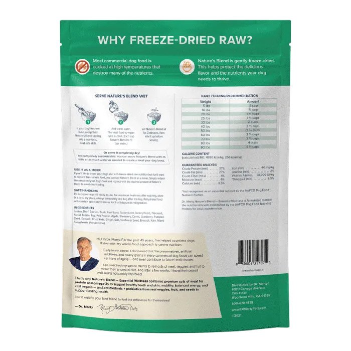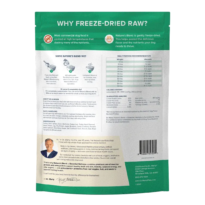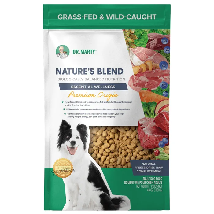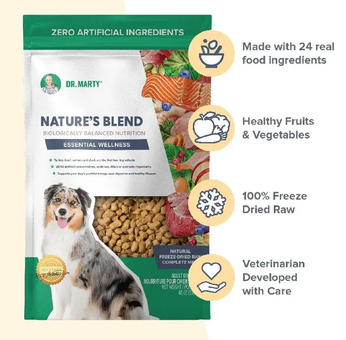 Dr. Marty Nature's Blend is.a premium, freeze-dried raw dog food formulated to support the health, happiness, and longevity of all adult dogs.