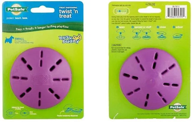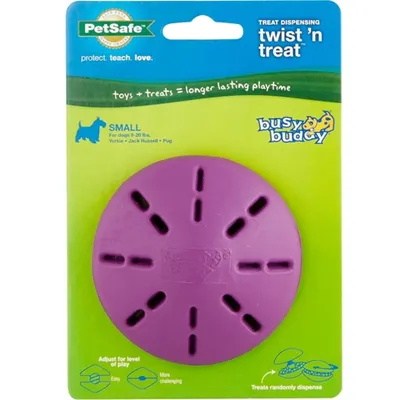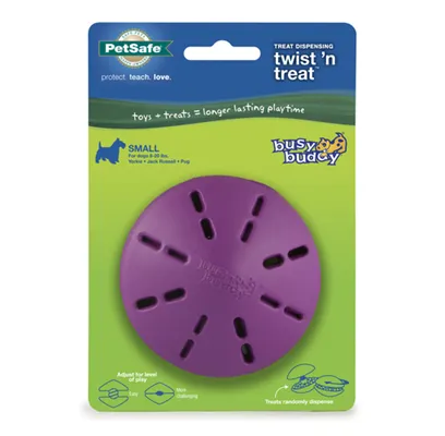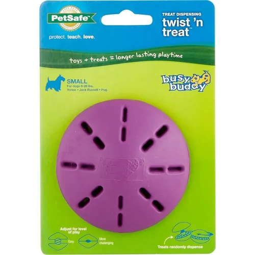 What dog doesn’t love a challenge? The PetSafe® Busy Buddy® Twist 'n Treat™ allows you to stuff his new favorite toy with a wide variety of treat options. Fill with hard, soft, and smearable treats. Twist the halves far apart to give your dog a quick reward or twist closer together for more of a challenge that will keep your pup playing for hours. Our patented Treat Meter® dispenses treats randomly while your dog plays with the toy. Trim the prongs to make treats come out faster. Available in extra small, small, medium and large. PetSafe® brand is here to help you and your pet live happy together™.