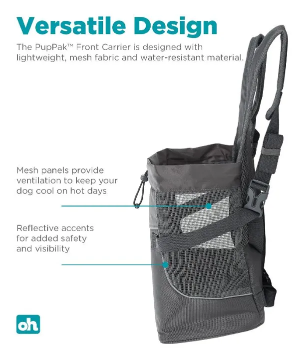 The PupPak Front Carrier features everything you love about your backpack with the bonus of carrying your 4-legged friend. Side pocket storage is great for stowing small essentials, and a large front zipped pocket keeps your valuables in plain sight giving you less to carry and worry about during your walk.