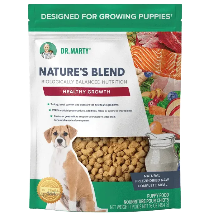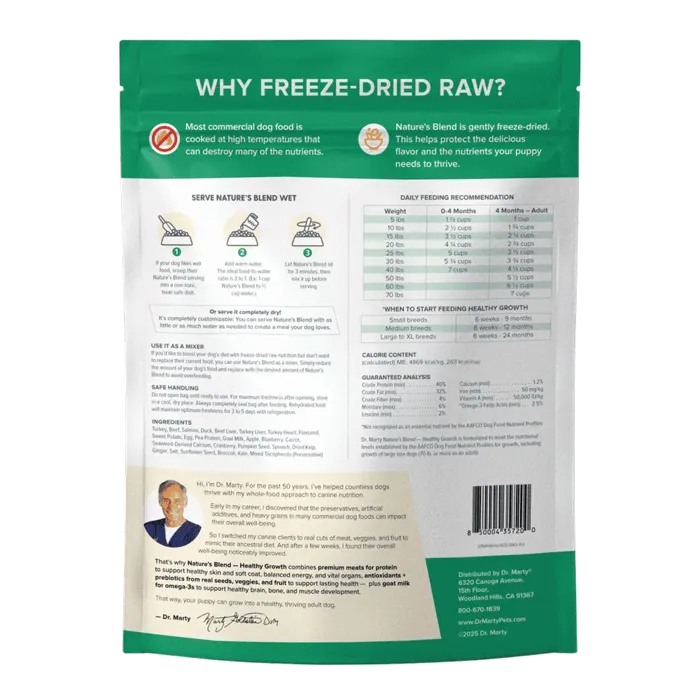Dr. Marty Nature’s Blend – Healthy Growth is a premium freeze-dried raw food made specifically for growing puppies. It combines premium meat, vegetables, fruit, and key superfoods to support your dog’s strong muscles, sharp mind, healthy heart, active energy, easy digestion, and healthy immune system… with ZERO artificial preservatives, or fillers.