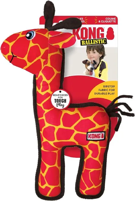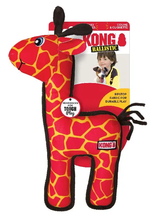 Kong Ballistic Giraffe is designed with a durable ripstop material and is built for long-lasting play. This giraffe’s long body is lined, stitched and seamed to standup to big adventures in or out of doors. A squeaker and rattle entice play while rewarding instinct-satisfying shaking fun.