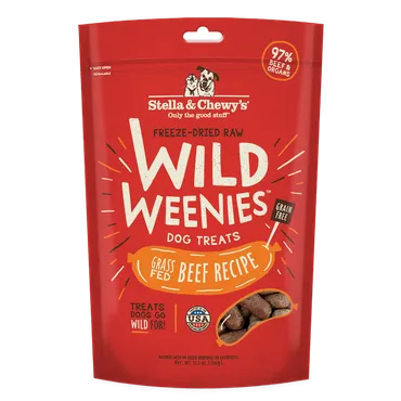 Stella & Chewy's Freeze-Dried Raw Wild Weenies dog treats are made with responsibly sourced ingredients in our own USA kitchen. Stella and Chewy's was built on a philosophy that feeding your pet a wholesome diet similar to what their ancestors enjoyed in the wild is the optimal way to help your pet thrive. These treats offer real raw nutrition and taste your dog will go wild for! For pet parents seeking to add nutrition, reward their dog or puppy for good behavior, or entice a picky eater, go with these freeze dried raw wild weenies. They’re the perfect training treat or snack, as your dog will simply love them. Dog's naturally crave meat much like they ate in the wilderness, and our Wild Weenies recipes are packed with responsibly sourced, animal-based protein from multiple meat sources for protein rich taste dogs crave with the nutrition they deserve. With low carbohydrates and no fillers, legumes, artificial colors, flavor or preservatives, these recipes will feed your dog’s wild side.