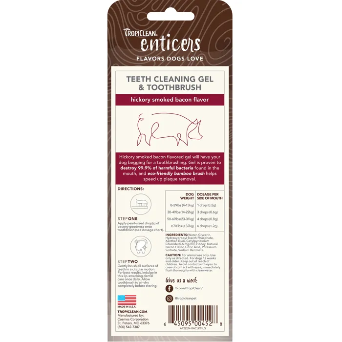 TropiClean Enticers Teeth Cleaning Gel – Hickory Smoked Bacon Flavor will have your dog begging for a toothbrushing. The smokey, savory flavor of bacon will make toothbrush time your dog’s favorite time. Gel is made with naturally derived ingredients and proven to help eliminate 99.9% of the root cause of plaque and bad breath. When used together, gel and included eco-friendly bamboo toothbrush help speed up the removal of pesky plaque and reduce bad breath. For tip-top teeth, brush once daily.• **Flavors Dogs Love** - Hickory Smoked Bacon Flavor is 3x more appetizing to dogs than competing oral care gels.• **Clean Teeth Guaranteed** - Gel helps eliminate 99.9% of the root cause of plaque and bad breath.• **Delectable Dental Care** - It's no secret dogs hate teeth cleaning time, but now they will crave it! Bacony gel will satisfy their natural cravings and leave their teeth sparkling clean.• **Powerful Brushing Duo** - When used with teeth cleaning gel, bamboo brush helps accelerate plaque removal.• **Eco-Friendly Brushing Solution** - Bamboo toothbrush is made with soft bristles and a plant-derived handle.