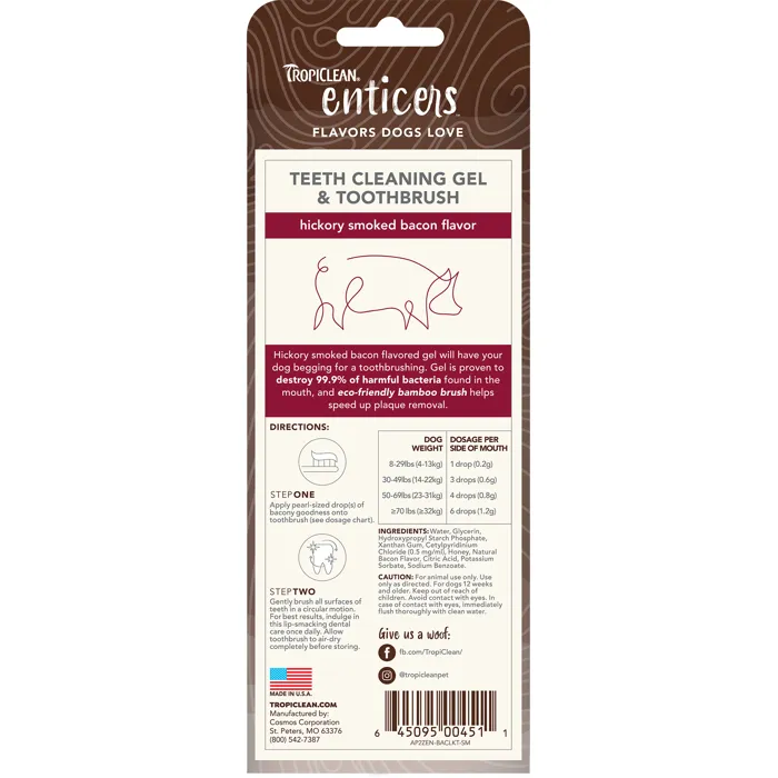 TropiClean Enticers Teeth Cleaning Gel – Hickory Smoked Bacon Flavor will have your dog begging for a toothbrushing. The smokey, savory flavor of bacon will make toothbrush time your dog’s favorite time. Gel is made with naturally derived ingredients and proven to help eliminate 99.9% of the root cause of plaque and bad breath. When used together, gel and included eco-friendly bamboo toothbrush help speed up the removal of pesky plaque and reduce bad breath. For tip-top teeth, brush once daily.• **Flavors Dogs Love** - Hickory Smoked Bacon Flavor is 3x more appetizing to dogs than competing oral care gels.• **Clean Teeth Guaranteed** - Gel helps eliminate 99.9% of the root cause of plaque and bad breath.• **Delectable Dental Care** - It's no secret dogs hate teeth cleaning time, but now they will crave it! Bacony gel will satisfy their natural cravings and leave their teeth sparkling clean.• **Powerful Brushing Duo** - When used with teeth cleaning gel, bamboo brush helps accelerate plaque removal.• **Eco-Friendly Brushing Solution** - Bamboo toothbrush is made with soft bristles and a plant-derived handle.