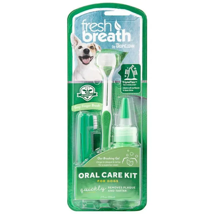 Oral care is a critical part of a dog’s overall health, making it an important responsibility of pet ownership. Even with routine professional cleanings, pets still need regular teeth brushing at home. The Fresh Breath Oral Care Kit for Large Dogs provides everything you need to establish a consistent oral care routine for your pet. The kit includes a Fresh Breath TripleFlex™ Toothbrush, Gentle Finger Brush, and Brushing Gel. When used regularly, you can provide your pet with top-notch dental care, right at home.• **Brushing Gel** — Formulated with a gentle blend of naturally derived ingredients that help reduce plaque and tartar buildup.• **TripleFlex™ Toothbrush** — Triple-head gives a 360-degree clean, covering all surfaces of the teeth. Clean plaque up to 3X faster!• **Gentle Finger Brush** — Easy, gentle brushing at the tip of your finger! Best for use on pets with sensitive gums or toothbrush aversion.• **All-in-One Solution** — Oral Care Kit provides everything you need to give your pet a deep cleaning at home, helping improve their dental health and freshen their breath!• **Naturally Derived Ingredients** – Contains ingredients that are made from either naturally occurring raw materials or are adapted from naturally occurring plant- or mineral-based raw materials.