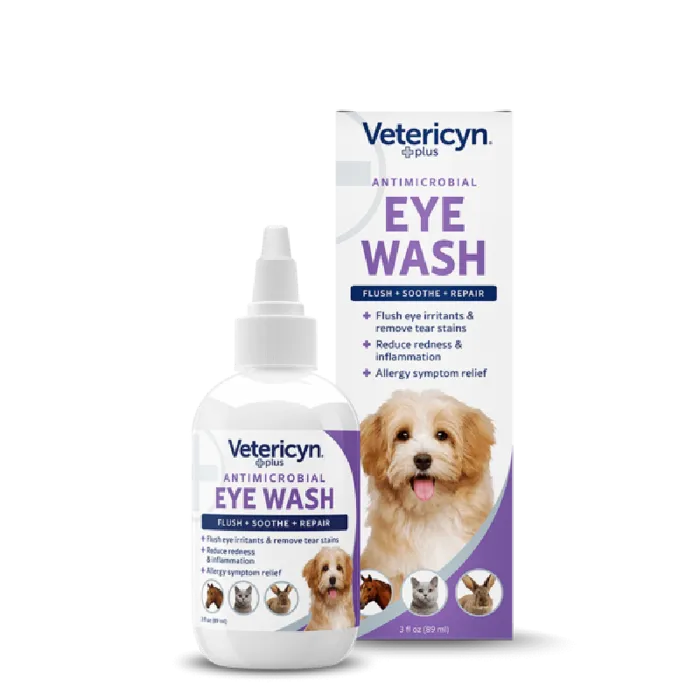 Vetericyn Plus Eye Wash is a non-stinging solution that gently cleans the eyes and surrounding tissue to help relieve irritation and burning, remove debris, and control issues caused by mucous, pollen, and other irritants. It also cleans tear stains to leave the fur surrounding the eye clean and free of the bacteria that leads to discoloration.