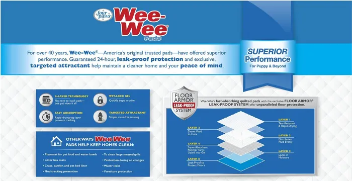 Keep your pup’s mess off of your floor with Four Paws Wee-Wee Absorbent Pads for Dogs. Featuring a 6-layer Floor Armor leak-proof system, these quilted pads are very absorbent and perfect for training both puppies and senior dogs of all sizes. They also contain a wet-lock gel that quickly traps urine with a targeted attractant to draw your dog to the pad. Oversized quilted pockets allow for maximum absorption making these pads from Four Paws as a great solution when you can’t be home.