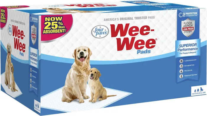 Keep your pup’s mess off of your floor with Four Paws Wee-Wee Absorbent Pads for Dogs. Featuring a 6-layer Floor Armor leak-proof system, these quilted pads are very absorbent and perfect for training both puppies and senior dogs of all sizes. They also contain a wet-lock gel that quickly traps urine with a targeted attractant to draw your dog to the pad. Oversized quilted pockets allow for maximum absorption making these pads from Four Paws as a great solution when you can’t be home.