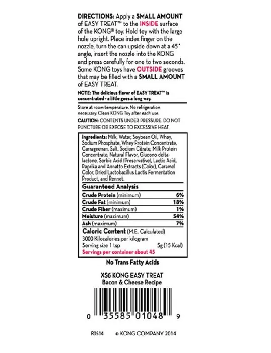 Playtime with your pal is now mess-free, hassle-free, and only a delicious dab away with the irresistible bacon and cheese flavor of the KONG Stuff'N Easy Treat Bacon & Cheese Recipe. With an easy-to-use, built-in nozzle, simply tilt and press to reward your best pal with a delectable treat anytime, or easily fill any KONG rubber toy for extended playtime. Your dog will love the delicious bacon and cheese flavor and lip-smacking texture! While he spends hours licking and savoring his favorite treat-stuffed KONG toy, you can feel good about providing a delicious, trans-fat free, highly-digestible reward. Freeze inside a KONG rubber toy for a longer-lasting, mentally-stimulating challenge.